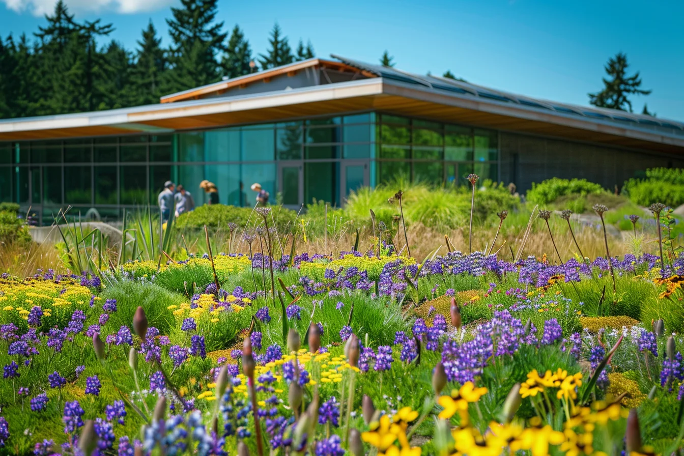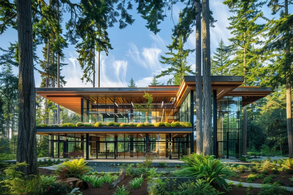 The green roof hosts native Pacific Northwest species while managing all stormwater on-site through integrated bioswales. An interior “research forest” atrium brings 40+ native tree species inside the building.