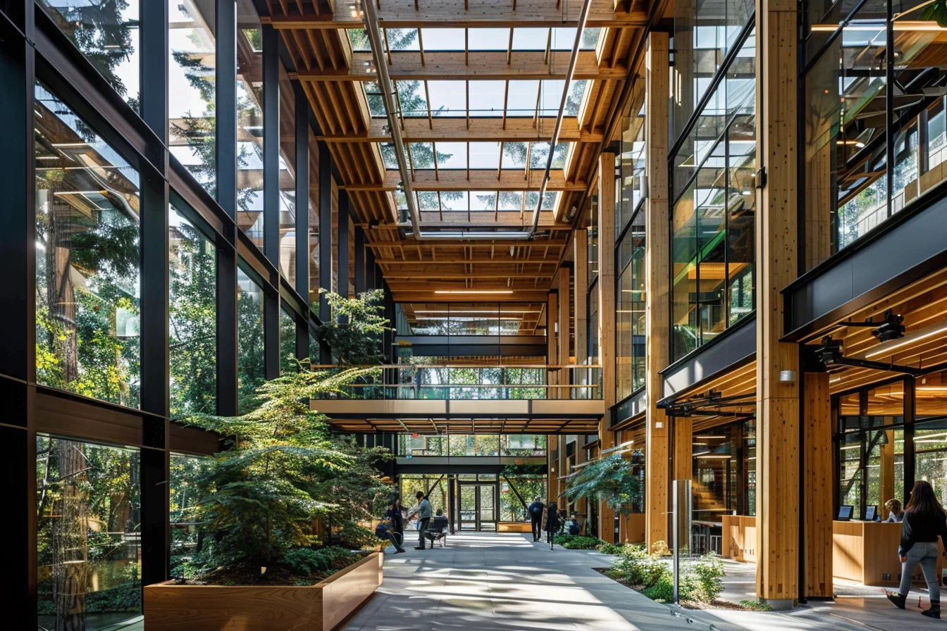 Cross-laminated timber from certified Oregon forests forms the building’s skeleton, storing 1,200 tons of CO₂. This mass timber system achieved 75% less embodied carbon than a traditional steel and concrete equivalent.
